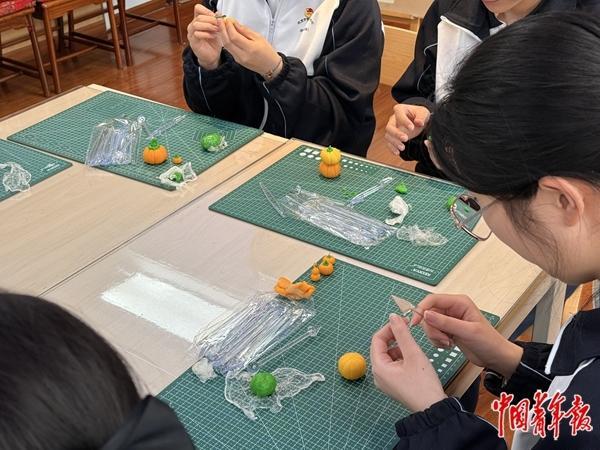 “一捧小小的面团,承载着中华历史的千年文化。”北京市外事学校普高班高二学生孙芳(化名)在非遗面塑选修课上感受到了民间面塑艺人的智慧与坚守。中青报·中青网记者看到,在老师的演示下,来自烹饪专业、酒店专业和普高班的学生将手中的面团捏成椭圆形,雕刻出纹理,组成一个个栩栩如生的南瓜和玉米。