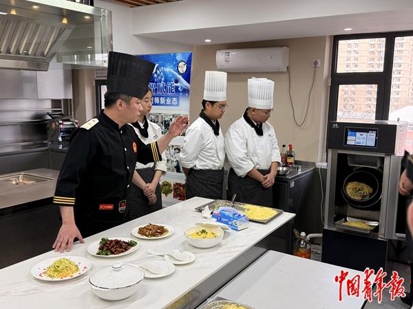 在北京市外事学校的烹饪实训室,中青报·中青网记者看到,烹饪专业教师李光辉正在用“炒饭机器人”向学生演示如何做出“颗粒分明、颜色金黄的扬州炒饭”;在“光影餐厅”实训室中,师生可以设计不同风格的宴会全息投影、插花造景和新式甜点。